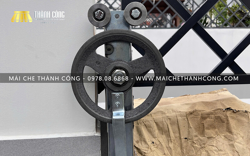 Đây là cơ chế nâng hạ thủ công giúp mái hiên di chuyển linh hoạt và dễ kiểm soát. Tại Mái Che Thành Công, tay quay được thiết kế chắc chắn, vừa tay, chống trượt, giúp thợ thi công thao tác nhanh, an toàn và giảm mệt mỏi khi nâng mái lớn.
